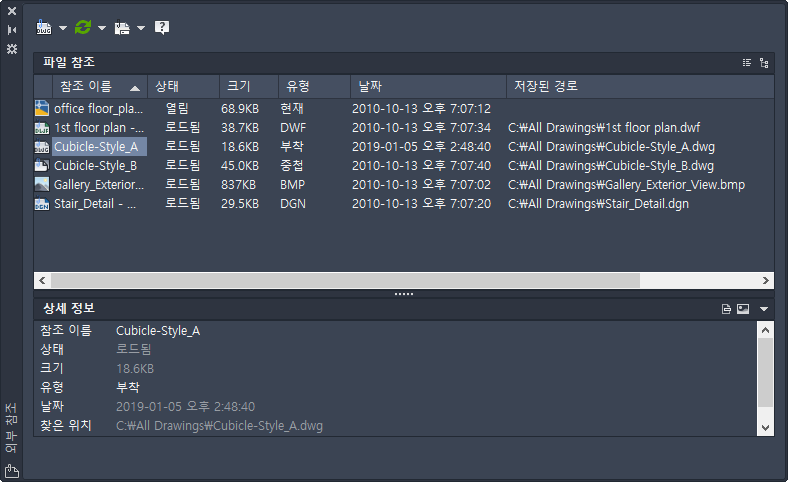 외부 참조 팔레트는 DWG 파일(xrefs), DWF, DWFx, PDF 또는 DGN 언더레이, 래스터 이미지, 점 구름(RCP 및 RCS 파일) 및 조정 모형(NWD 및 NWC 파일)과 같은 참조된 파일을 구성하고, 표시하고, 관리합니다.
