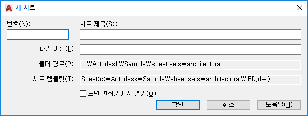 시트 번호를 지정합니다. 처음 시트를 작성할 때 시트 번호를 채우지 않는 것이 좋습니다. 기본적으로 새 시트의 도면 이름 및 배치 이름은 시트 제목을 가진 시트 번호입니다.