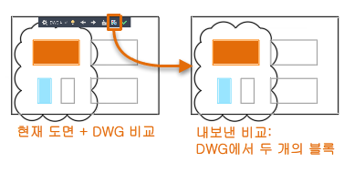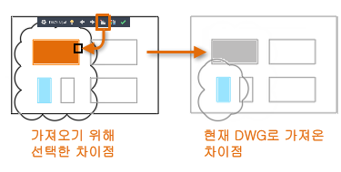 DWG 비교 도구막대를 사용하여, 비교 도면에서 현재 도면으로 차이점을 가져올 수 있습니다. 비교 도면에서 차이점이 있는 객체만 현재 도면으로 가져올 수 있습니다. 이 명령은 이전 버전 도면과 함께 현재 도면을 조정하는 효과적인 방법을 제공합니다.