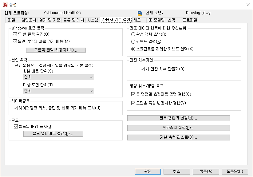 오른쪽 클릭 사용자화 대화상자를 표시합니다. 이 대화상자의 도면 영역 옵션에서 바로 가기 메뉴를 추가로 정의할 수 있습니다. (SHORTCUTMENU 시스템 변수)