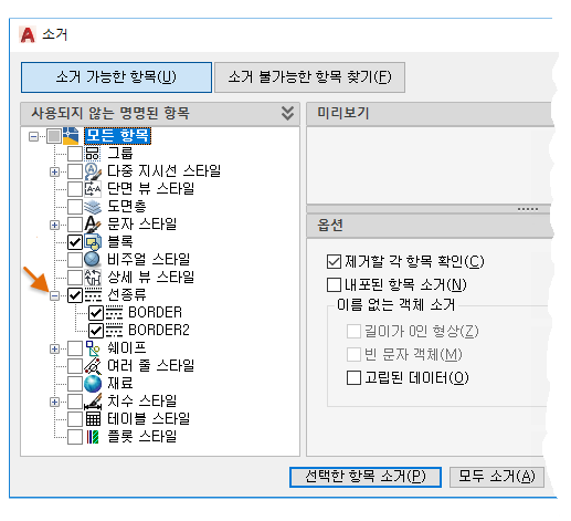 - 참조되지 않은 선종류를 모두 소거하려면 선종류를 선택합니다.