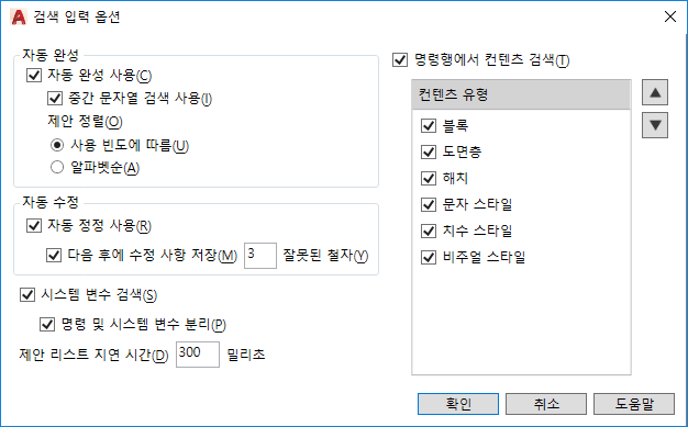명령, 시스템 변수 및 명명된 컨텐츠(예: 블록 및 도면층)에 대한 명령행 제안 사항 리스트의 표시에 대한 설정을 조정합니다.