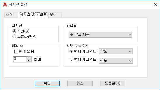 지시선 주석 유형을 설정합니다. 선택한 유형에 따라 QLEADER 지시선 주석 프롬프트가 변경됩니다.