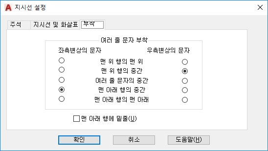 지시선과 여러 줄 문자 주석의 부착 위치를 설정합니다. 주석 탭에서 여러 줄 문자를 선택한 경우에만 이 탭을 사용할 수 있습니다.