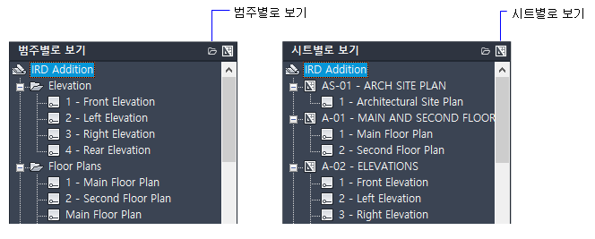 시트 리스트 탭에서 시트를 하위 세트라는 집합으로 정렬할 수 있습니다. 시트 뷰 탭에서 뷰를 범주라는 집합으로 정렬할 수 있습니다.