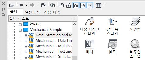 폴더, 도면 열기, 사용 내역 탭을 통해 여러 가지 방법으로 컨텐츠에 액세스할 수 있습니다.