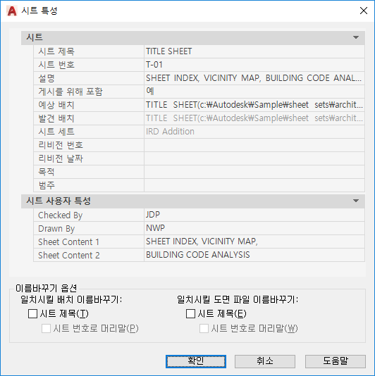 선택한 시트의 특성을 표시합니다. 또한 사용자 특성을 표시합니다(있는 경우). 새 값을 입력하여 시트 특성을 수정할 수 있습니다. 예상 배치는 시트가 저장된 도면의 경로 및 파일 이름입니다. 발견 배치는 시트가 발견된 도면의 경로 및 파일 이름입니다. 경로가 다른 경우 예상 배치에서 경로 및 파일 이름을 수정할 수 있습니다. 이 작업은 시트를 시트 세트와 다시 연관시킵니다.