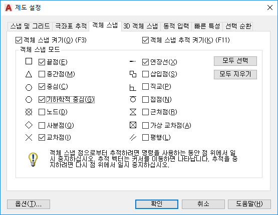 지정된 모든 객체 스냅 모드를 켤지 또는 끌지 조정합니다. (OSMODE 시스템 변수)
