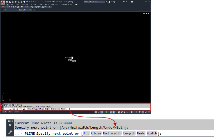 고정된 명령 윈도우는 응용프로그램 윈도우와 폭이 같습니다. 이 윈도우는 도면 영역 위나 아래의 고정된 위치에 표시됩니다.