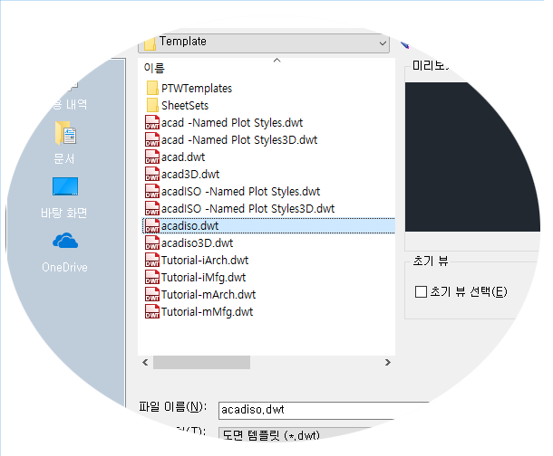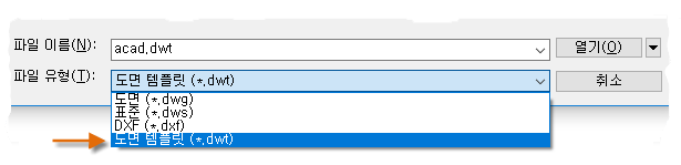 기존 도면 템플릿 파일을 수정하려면 열기를 클릭하고 파일 선택 대화상자에서 도면 템플릿(*.dwt)을 지정한 후에 템플릿 파일을 선택합니다.