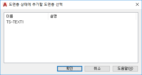 도면층 상태에 추가되지 않은 도면층의 이름 및 설명을 표시합니다. 추가할 도면층을 선택하고 확인을 클릭합니다.