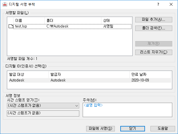이 대화상자에 나열된 모든 파일에 디지털 서명을 부착합니다.