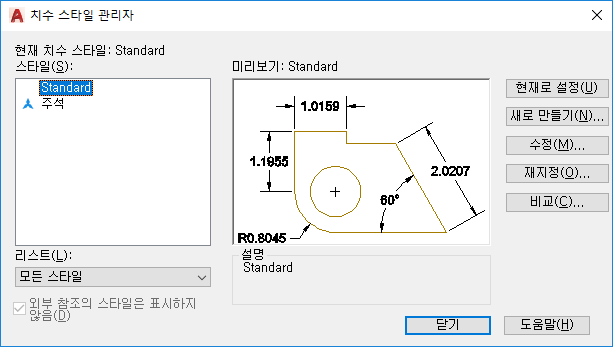 현재 치수 스타일의 이름을 표시합니다. 기본 치수 스타일은 STANDARD입니다. 작성한 치수에 현재 스타일이 적용됩니다.
