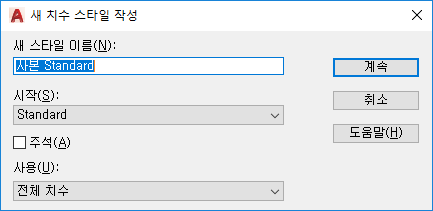 새 치수 스타일을 명명하고 새 치수 스타일을 시작할 스타일을 설정하며 새 스타일을 적용할 치수 스타일을 표시합니다.