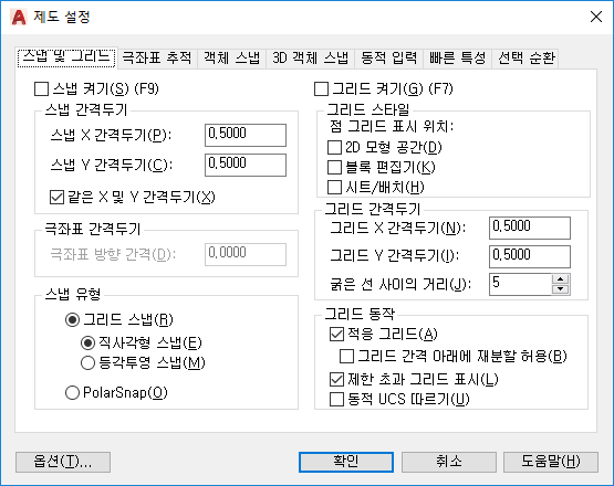 스냅 및 그리드 탭(제도 설정 대화상자)