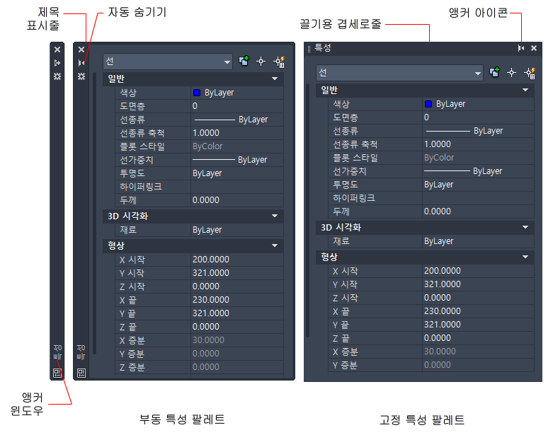 리본, 특성 팔레트, 도구 팔레트, 명령 윈도우 및 DesignCenter 등의 윈도우를 고정, 앵커 또는 부동 상태로 만들 수 있습니다. 이 기능과 다른 옵션의 설정은 팔레트 또는 윈도우의 제목 표시줄을 마우스 오른쪽 버튼으로 클릭하여 사용할 수 있는 바로 가기 메뉴에서 변경할 수 있습니다.