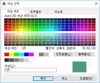 AutoCAD 색상 색인(ACI)에서 세 개의 탭에 있는 255개의 색상, 트루컬러, 색상표 중에서 선택할 수 있습니다.