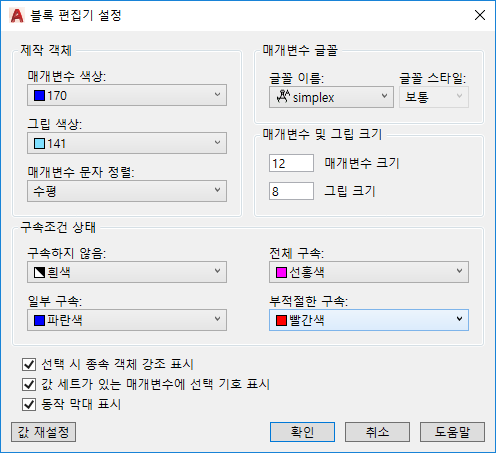 블록 편집기에 대해 색상, 문자, 그립, 구속조건 및 기타 표시 설정을 수정합니다.