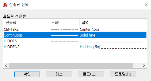 선택된 선종류를 도면에 로드하고 선종류 리스트에 추가할 수 있는 선종류 로드 또는 다시 로드 대화상자를 표시합니다.