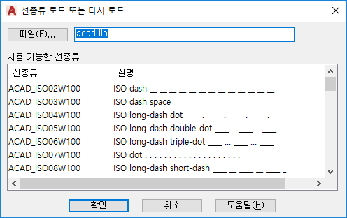 선종류 정의가 선종류 라이브러리(LIN) 파일에 있는 선종류를 로드합니다.