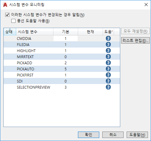 - 시스템 변수 리스트 편집 대화상자를 표시합니다.