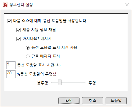 풍선 도움말 기능이 켜지는지 꺼지는지를 조정합니다.