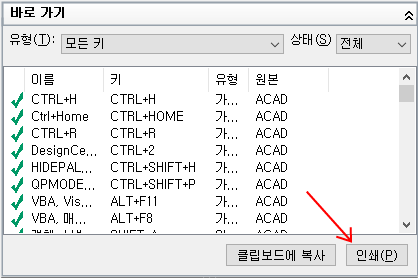 바로 가기 키 또는 임시 재지정 키의 리스트 인쇄