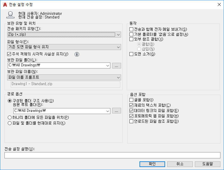 이 필드를 변경하지 않고 그대로 둘 경우, 전송 파일은 첫 번째 지정된 도면 파일이 들어 있는 폴더에 작성됩니다. 시트 세트 환경에서 전송 파일은 시트 세트 데이터(DST) 파일이 들어 있는 폴더에 작성됩니다. AutoCAD LT에는 해당되지 않습니다.
