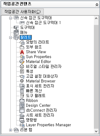 - 사용자화 탭에 있는 <파일 이름>의 사용자화 창에서 작업공간 노드 옆에 있는 더하기 기호(+)를 클릭하여 노드를 확장합니다.
