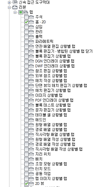 - 작업공간에 추가할 각 리본 탭 옆의 확인란을 클릭합니다.
