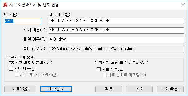 이 옵션이 선택되면 시트 제목의 맨 앞에 시트 번호를 추가해서 형성된 새 이름으로 도면 파일 이름을 변경합니다.