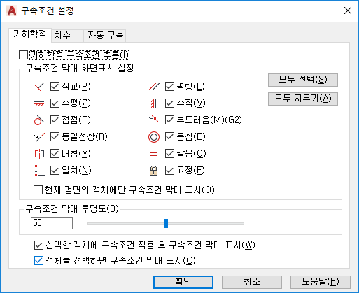 여러 유형의 구속조건에 대한 설정이 서로 다른 탭에 있습니다.