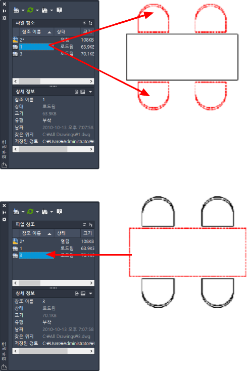 부착된 외부 참조는 지정된 도면 파일의 모형 공간에 대한 링크입니다. 도면을 열거나 외부 참조를 다시 로드하면 참조된 도면의 변경 사항이 현재 도면에 자동으로 반영됩니다. 외부 참조를 부착해도 현재 도면의 크기가 크게 증가되지는 않습니다.