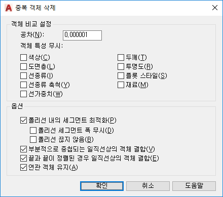 이 설정을 사용하여 OVERKILL에서 선, 호 및 폴리선을 처리하는 방법을 조정합니다.
