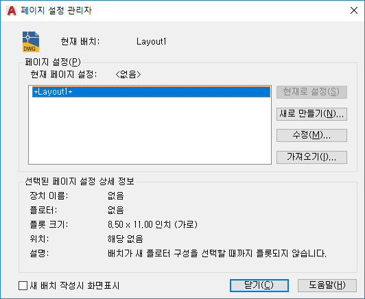 또한 명명된 페이지 설정을 작성하거나 기존 페이지 설정을 수정하거나 또는 다른 도면에서 페이지 설정을 가져올 수 있습니다.