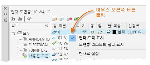 도면층 리스트 맨 위에 도면층 필터를 표시합니다. 이 옵션을 선택 해제하면 도면층 리스트에 도면층만 표시됩니다.