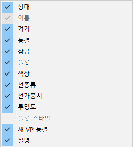 전체 열을 이름별로 나열합니다. 선택 표식은 열이 표시에 포함됨을 나타냅니다. 열 이름을 클릭하면 해당 열을 표시하거나 숨길 수 있습니다. VP 동결, VP 색상, VP 선종류, VP 선가중치 및 VP 플롯 스타일은 배치 뷰포트가 활성화된 경우에만 사용할 수 있습니다.