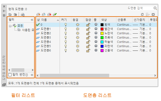 상자에 문자를 입력하면 이름별로 도면층 리스트를 필터링합니다.