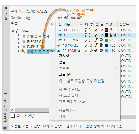 선택한 도면층 필터를 제거합니다. 모든 도면층, 사용된 모든 도면층 또는 외부 참조 도면층 필터는 삭제할 수 없습니다.