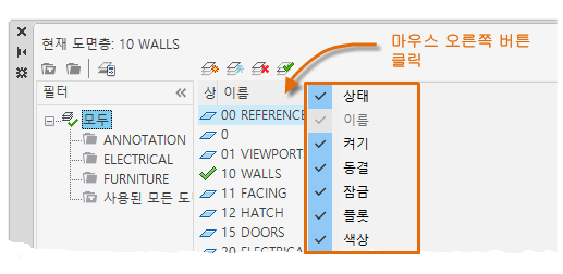 도면층 설정 대화상자를 표시합니다. 여기서 다양한 화면표시 옵션을 설정할 수 있습니다.