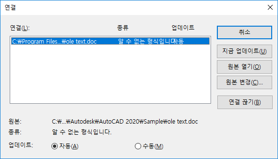 객체와 원본 파일 사이의 연결을 끊습니다. 도면의 객체가 WMF(Windows 메타파일 형식)로 변경되며 이 메타파일은 원본 파일이 이후에 변경되더라도 영향을 받지 않습니다.