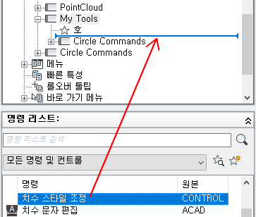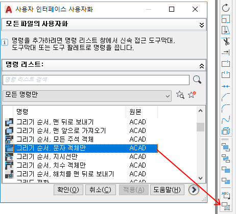 2. 도구막대에 추가할 명령을 명령 리스트 창에서 <파일 이름>의 사용자화 창으로 끕니다.