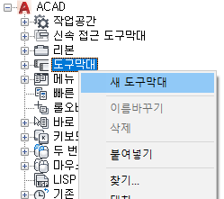 1. 사용자화 탭에 있는 <파일 이름>의 사용자화 창에서 도구막대 노드를 마우스 오른쪽 버튼으로 클릭하고 새 도구막대를 클릭합니다.