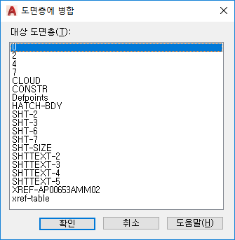 이 대화상자는 선택한 도면층이 병합될 도면층을 지정합니다. 병합된 도면층은 이 대화상자에서 선택한 도면층의 특성을 상속합니다.