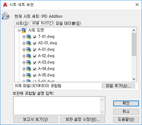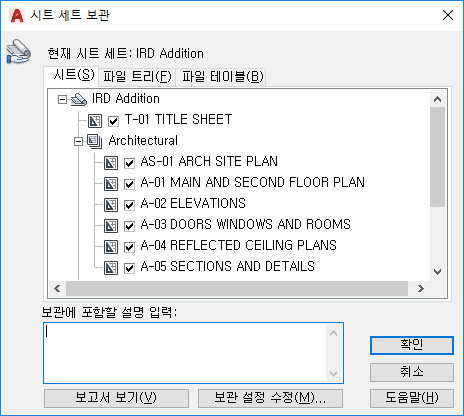 전송 패키지에 포함할 시트를 시트 순서와 하위 세트 구조에 따라 나열합니다. 시트 세트는 시트 세트 관리자에서 열어야 합니다. 최상위 시트 세트 노드를 마우스 오른쪽 버튼으로 클릭하면 표시되는 바로 가기 메뉴에서 보관을 선택하거나, 명령 프롬프트에서 ARCHIVE를 입력할 수 있습니다.