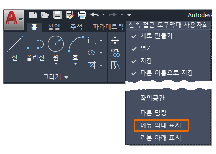 메뉴 막대는 빠른 액세스 도구 모음 드롭다운에서 사용할 수 있거나 CUI로 사용자 인터페이스를 사용자화하여 사용할 수 있습니다.