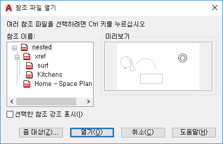 외부 참조가 내포된 경우 선택한 도면 참조(외부 참조)를 새 윈도우에서 엽니다.