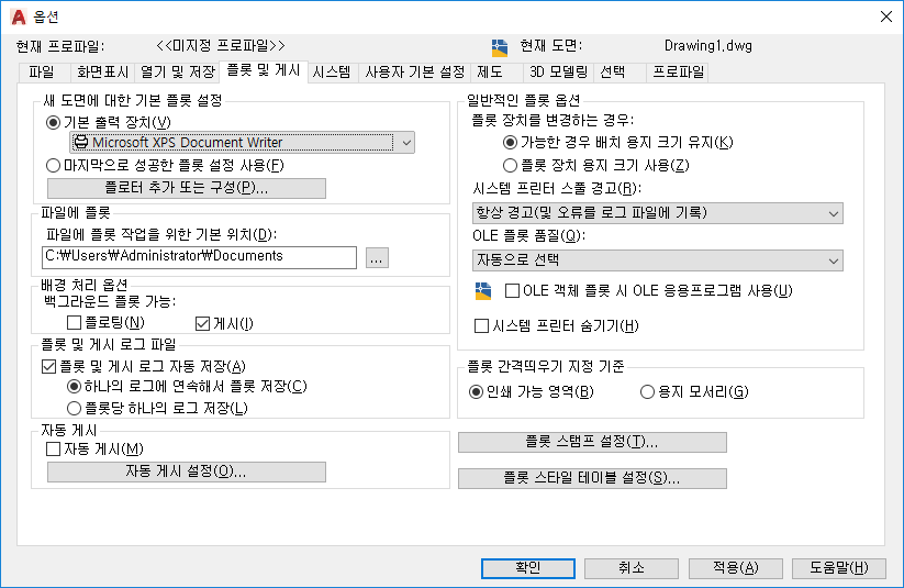 AutoCAD 릴리즈 14 또는 이전 버전에서 작성되어 AutoCAD 2000 및 이후 형식으로 저장된 적이 없는 도면이나 새 도면에 대한 기본 플롯 설정을 조정합니다.