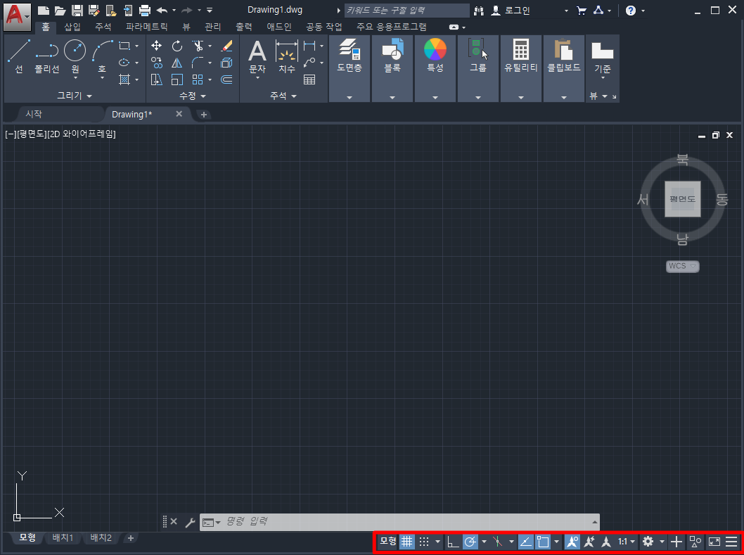 상태막대에는 도면 환경에 영향을 주는 도구, 도면 도구 및 커서 위치가 표시됩니다.