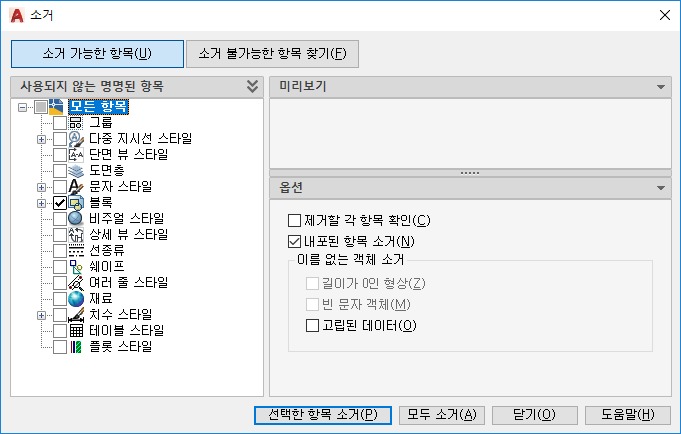 도면에서 사용되지 않는 모든 명명된 객체가 사용되지 않는 다른 명명된 객체에 포함되어 있거나 참조되는 경우에도 이들 객체를 제거합니다.
